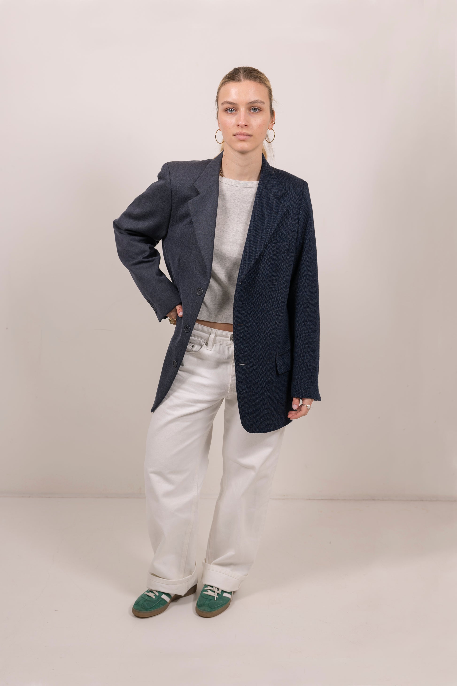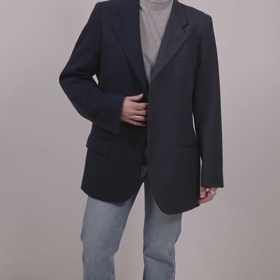 Turned two classic blazers from past designs into this entirely new piece. Bruno has a single-breasted front and pairs navy wool perfectly with grey. Pair yours with a slip dress or tonal pants and this one will work whatever the season.